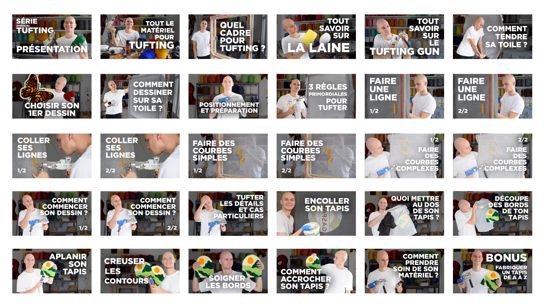 Voici la série de vidéos sur le tufting la plus complète que tu trouveras en français. J’ai préparé plus de 4h10 de contenu vidéo, le tout divisé en 25 épisodes répartis sur 30 vidéos différentes. Ces vidéos ne sont pas seulement des tutoriels : je ne t’explique pas uniquement comment faire. Je t’explique et te montre en détail chaque erreur que tu peux rencontrer à chaque étape de la fabrication de ton tapis, et je t’explique comment faire pour ne plus les reproduire. Chacune des vidéos est construite en sous-parties, avec tout un tas de schémas explicatifs et de plans différents pour te montrer au mieux ce que j’explique.